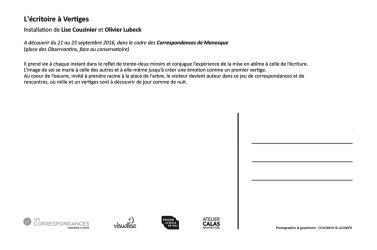 cartepostaleversoecritoire 17 novembre 2016 Return to: L’Ecritoire à Vertiges #1 aux Correspondances de ManosquePleine résolution (377 × 250) Image navigation Image précédente Image suivante Carte postale verso Ecritoire à Vertiges #1