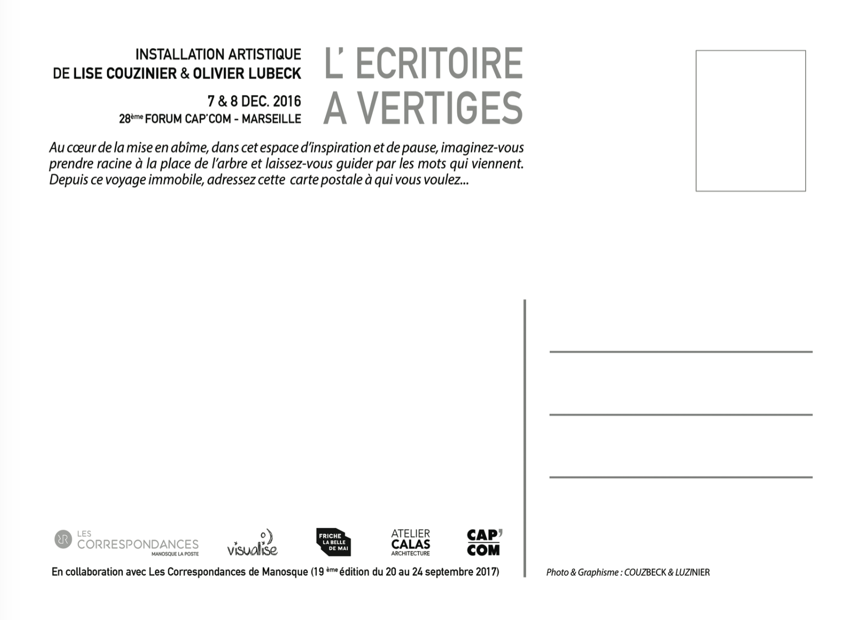 carte-postale-verso-ecritoire-dec 30 novembre 2016 Return to: L’Ecritoire à Vertiges #3 au 28 ème Forum CAP’COM, MarseillePleine résolution (1748 × 1252) Image navigation Image précédente Image suivante